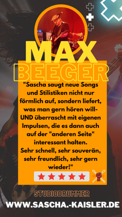 "Sascha Kaisler ist für mich vor allem deswegen ein sehr guter Studio Drummer, da er nicht nur tight spielt und zuverlässig ist, sondern auch sehr musikalisch und dynamisch